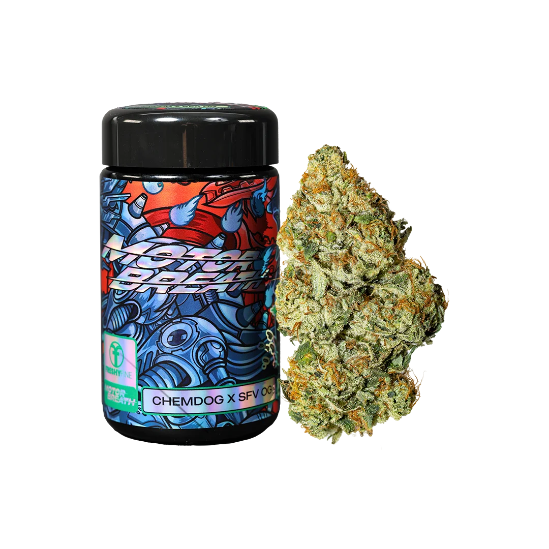 Unwind with power and flavor in Freshy Fine Motorbreath (Chemdog x SFV OG Kush) — a 7g premium indica-dominant flower jar designed for deep comfort and smooth taste. This potent strain fuses Chemdog’s distinctive gas aroma with OG Kush’s earthy calm, creating an indulgent smoke perfect for easing tension and ending the day peacefully.