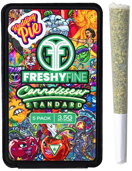 Freshy Fine Wedding Pie five pack offers calming, tingly uplift in 3.5g. Earthy sweet hybrid for inflammation, depression, insomnia relief.